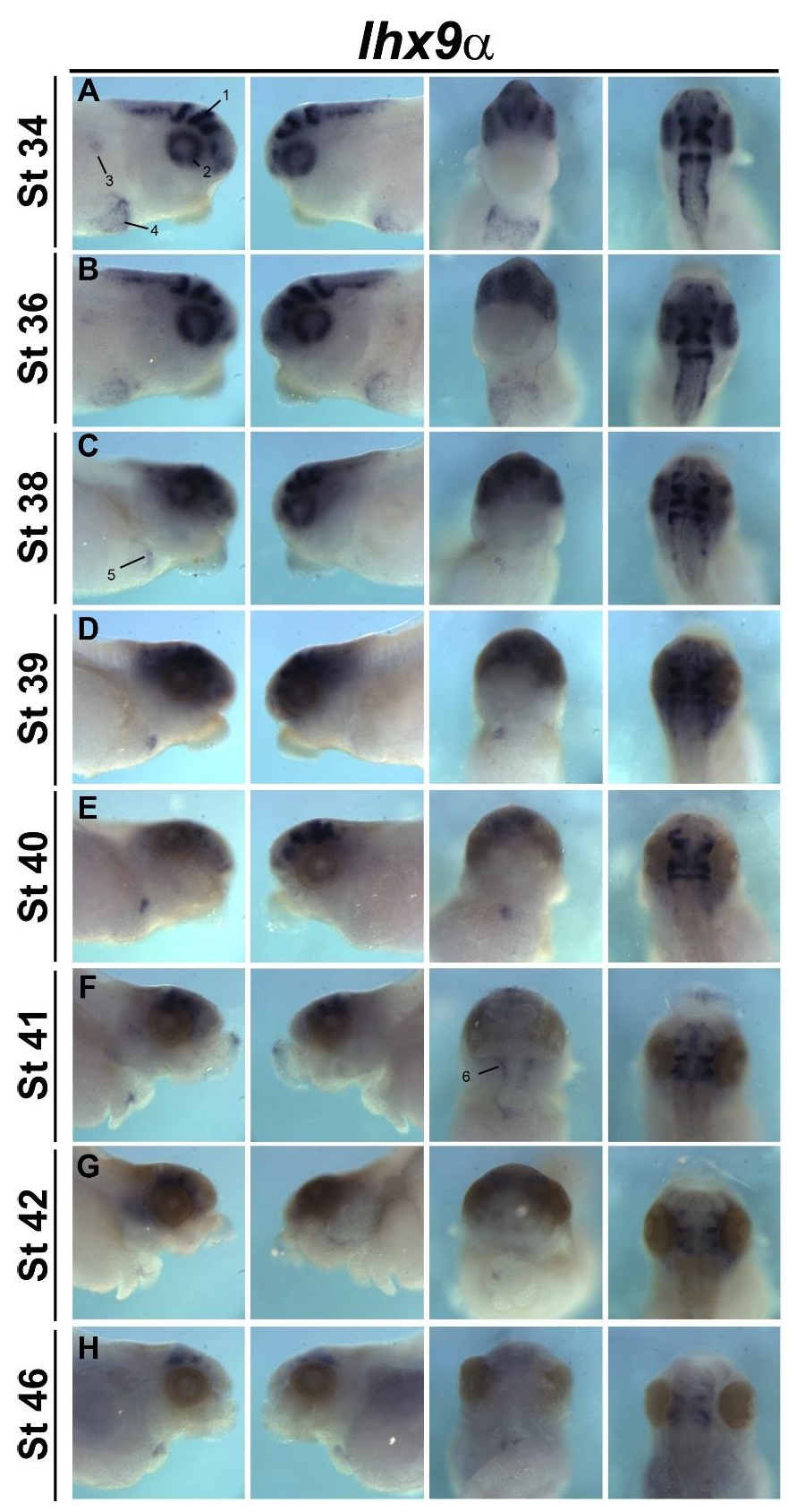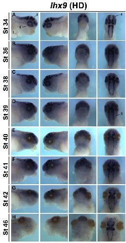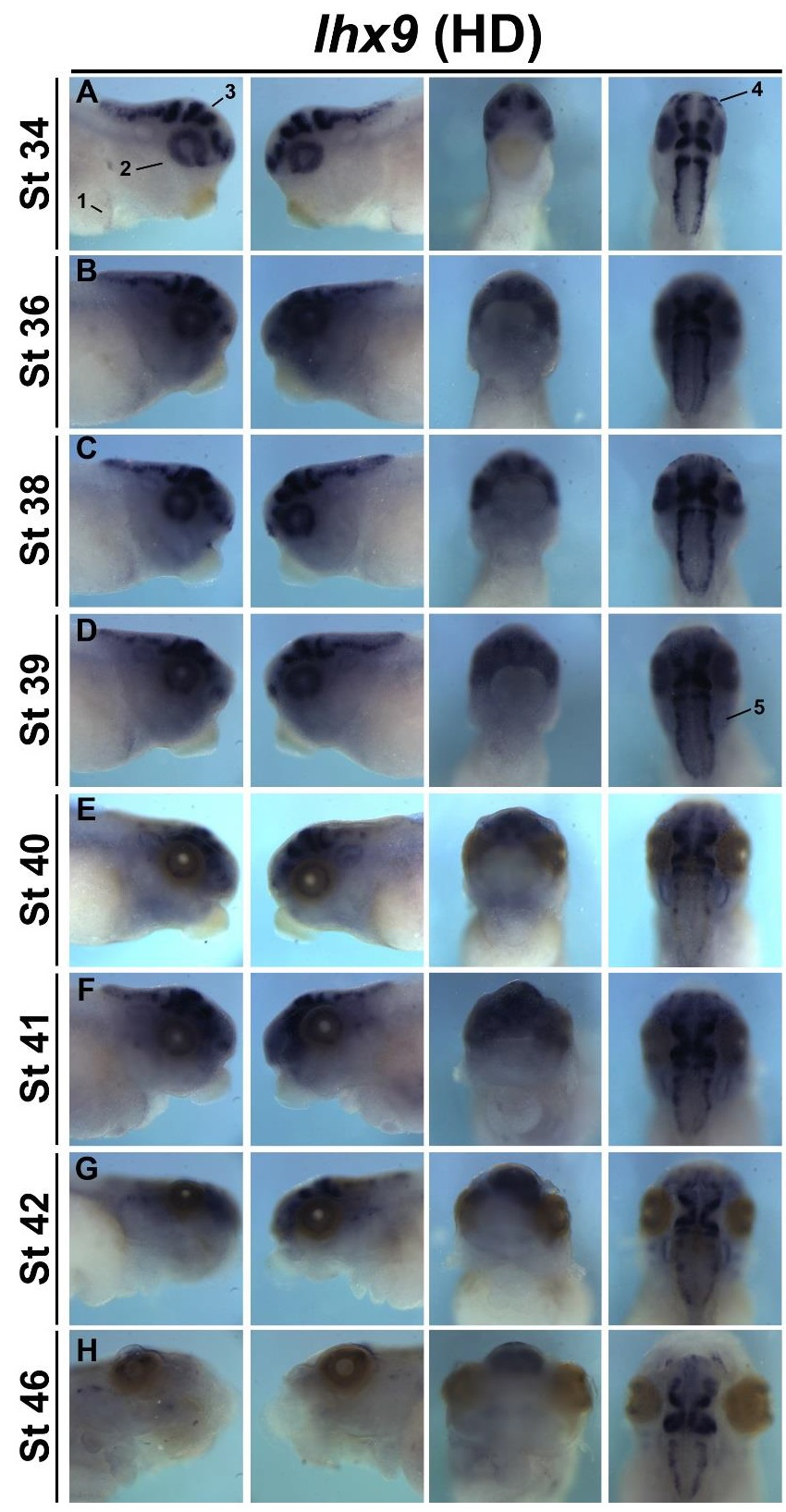 Figure S5. Spatio-temporal analysis of lhx9HD during Xenopus embryogenesis. In situ hybridization right, left, ventral and dorsal views of wild-type embryos showing lhx9HD expression of the anterior region over time, from stage 34 to stage 46. 1; septum transversum, 2; retina, 3; neural tube, 4; nasal placode, 5; otic placode. |