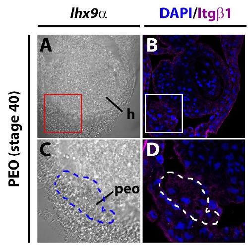 Figure S11. Lhx9α expression correlates with epicardial maker Integrin β1 Transverse agarose sections demonstrate the co-localization of lhx9α in situ hybridization (A, C) with the epicardial cell marker Itgβ1 (B, D, magenta) and DAPI (blue) at stage 40. Magnified images (C, D) shown in boxes (A, B). h, heart; peo, proepicardial organ. |