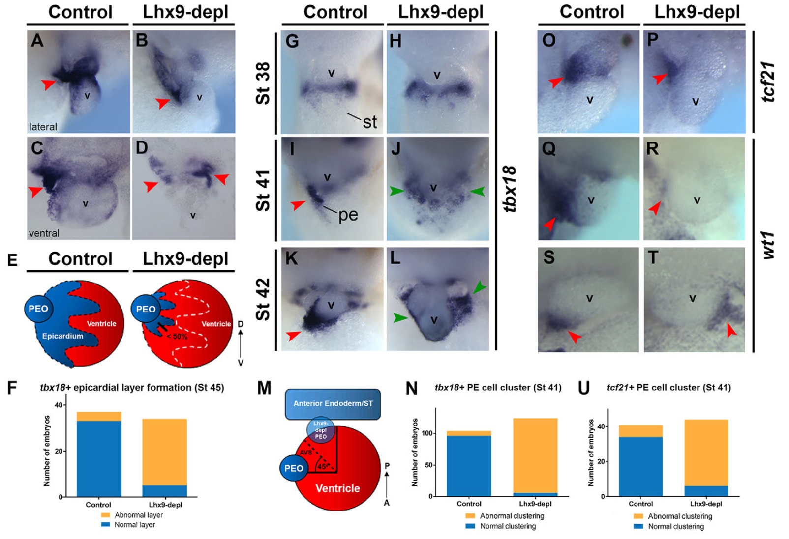Fig. 2. Lhx9 is required for proper epicardial layer and PE cluster formation. Epicardial layer formation (as shown with tbx18) analysis in control (A,C) and Lhx9-depleted (B,D) embryos at stage 45. (A,B) Images show lateral view of cardiac region, dorsal to the top and anterior to right. (C,D) Transverse gelatin sections through representative embryo cardiac regions showing tbx18 expression, dorsal to the top. PE cell clustering (red arrowheads) and epicardial cell layer on the ventricular surface is shown. (E) Epicardial layer formation defects were quantified as abnormal whenâ¤50% of the ventricle is covered, as depicted in schematic. (F) Quantification of observed epicardial layer formation defects, as represented in A-D, from three independent experiments, Pâ¤0.0001 by two-tailed Fisherâs exact test. Proepicardial clustering morphology was analyzed using in situ hybridization for tbx18 in control (G,I,K) and Lhx9-depleted (H,J,L) embryos at stage 38 (G,H), stage 41 (I,J) and stage 42 (K,L). Ventral view showing cardiac region, anterior to the top. Tbx18 expression is detected as a cluster of cells in control embryos on the right of the embryo near the atrioventricular sulcus (I,K, red arrowheads), whereas in Lhx9-depleted embryos, the cluster is either not detected and tbx18 expression remains throughout the septum transversum region or is mis-positioned to the caudal side of the heart (abnormal clustering) (J,L, green arrowheads). (M) Quantification of PE clustering defects is depicted in the schematic as being abnormal by bilateral tbx18 expression retention on septum transversum and/or cluster mis-positioning of â¥45° caudal to the AVS compared with controls. (N) Quantification of observed clustering phenotype at stage 41 represented in C and D. Data taken from seven independent experiments, Pâ¤0.0001 by two-tailed Fisherâs exact test. (O-T) In situ hybridization analysis for tcf21 (O,P,U) and wt1 (Q-T) proepicardial expression at stage 41. Images depict lateral view of the cardiac region, dorsal to the top and anterior to the right (M-P) or ventral view, dorsal to top (Q,R). Red arrowheads indicate clustered PE cells. (U) Quantification of observed phenotypes as depicted in M, data taken from six independent experiments, Pâ¤0.0001 by two-tailed Fisherâs exact test. avs, atrioventricular sulcus; pe/peo, proepicardial organ; st, septum transversum; v, ventricle. |