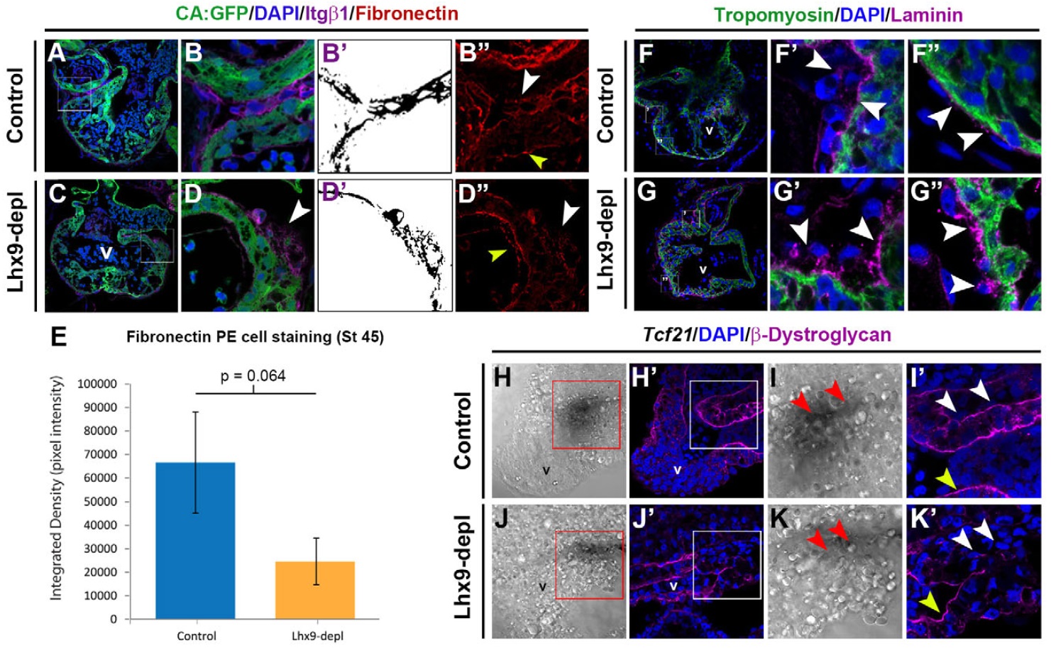 Fig. 5. Disrupted Lhx9-integrin signaling alters epicardial ECM environment. (A-E) Transverse cardiac agarose sections from control (A,B) and Lhx9- depleted (C,D) Xla.Tg(Cardiac-actin:GFP)Mohun embryos at stage 45. Nuclei stained with DAPI (blue), GFP labels cardiomyocytes (green) and immunohistochemical expression for Itgβ1 (B,D, magenta) to label epicardial cells and fibronectin (Bâ²,Dâ², red). Threshold binary images (ImageJ) in Bâ² and Dâ² show Itgβ1-positive epicardial cells used to quantify pixel intensity in Bâ² and Dâ². (E) Pixel intensity (integrated density) levels for fibronectin from five control and 10 Lhx9-depleted embryos, P=0.064 by two-tailed Studentâs t-test. (F-K) Transverse cardiac agarose sections from control (F,H,I) and Lhx9-depleted (G,J,K) embryos at stage 45. Nuclei stained with DAPI (blue) and immunohistochemical stain for tropomyosin (cardiomyocytes, F,G, green), laminin (F,G, magenta) and β-dystroglycan (Hâ²-Kâ², magenta). Tcf21 expression (H-K) demonstrates PE cell attachment to the heart. Red boxes in H,J are magnified in I,K; white boxes in Hâ²,Jâ² are magnified in Iâ²,Kâ². White arrowheads label PE (Fâ²,Gâ²,Iâ²,Kâ²) and migrating epicardial cells (Fâ²,Gâ²). Yellow arrowheads label expression in endocardial tissue (Bâ²,Dâ²,Iâ²,Kâ²). v, ventricle. Representative images from seven (laminin) and six (β-dystroglycan) embryos per condition, from two independent experiments. |