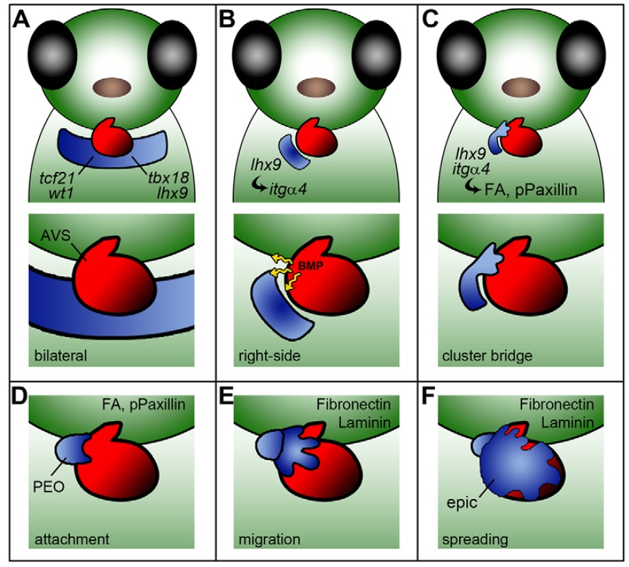 Fig. 6. Model depicting role of Lhx9 in epicardial development in Xenopus. (A) During early tadpole stages, the epicardial lineage is determined and marked by transcription factors tcf21, tbx18, wt1 and lhx9 (blue) as a bilateral population of cells on the septum transversum caudal to the heart (red). (B) Lhx9 functions to drive clustering of cells to form the proepicardial cluster on the right side of the embryo (blue), whereby itga4 expression is activated. At this stage, signaling factors, most likely BMP (yellow arrows), from the heart atrioventricular sulcus (AVS) direct epicardial migration. (C,D) Lhx9-integrin-mediated signaling, including focal adhesion (FA) formation and phosphorylation of paxillin (pPaxillin), allows the PEO bridge (blue) to attach to the heart (red) at the AVS. (E,F) Once the PEO has attached to the heart, deposition of essential ECM components such as fibronectin and laminin are required for the epicardial layer (epic) to adhere and spread over the heart surface. |