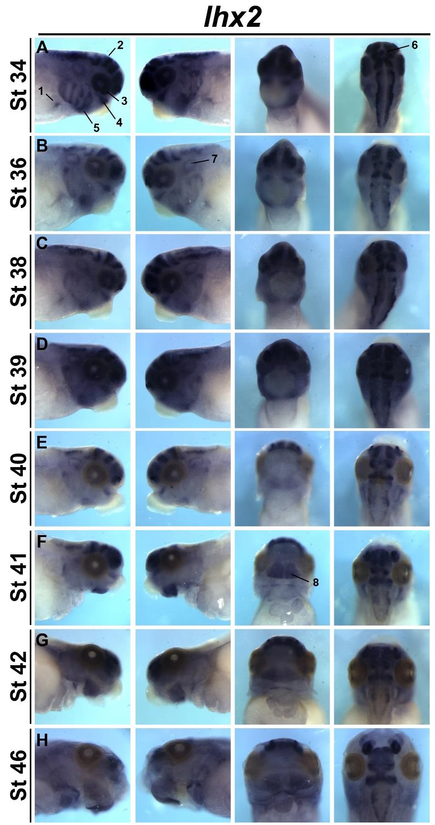Figure S6. Spatio-temporal analysis of lhx2 during Xenopus embryogenesis. In situ hybridization right, left, ventral and dorsal views of wild-type embryos showing lhx2 expression of the anterior region over time, from stage 34 to stage 46. 1; lung bud, 2; neural tube, 3; retina, 4; mandibular arch, 5; branchial arches, 6; pineal gland, 7; otic placode, 8; lower jaw. |