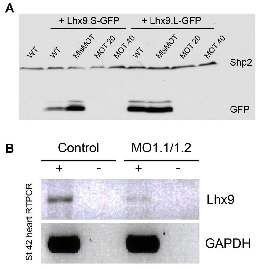 Figure S7. Validation of Lhx9 depletion assays. (A) Validation of MO-specific inhibition of Lhx9 translation by GFP western blot on stage 11 embryos, injected with 1ng Lhx9-5’UTR-GFP RNA and MO at various concentrations (20-40 ng). Shp2 is used as a protein loading control. MOT targets the translational start site from both the short and long genomic versions of X. laevis Lhx9. (B) RT-PCR analysis of cardiac cDNA from stage 42 embryos injected with both MO1 (30ng each) targeting the short and long genomic versions of X. laevis Lhx9. Negative control lanes (-) are without superscript II enzyme, GAPDH PCR as loading control. |