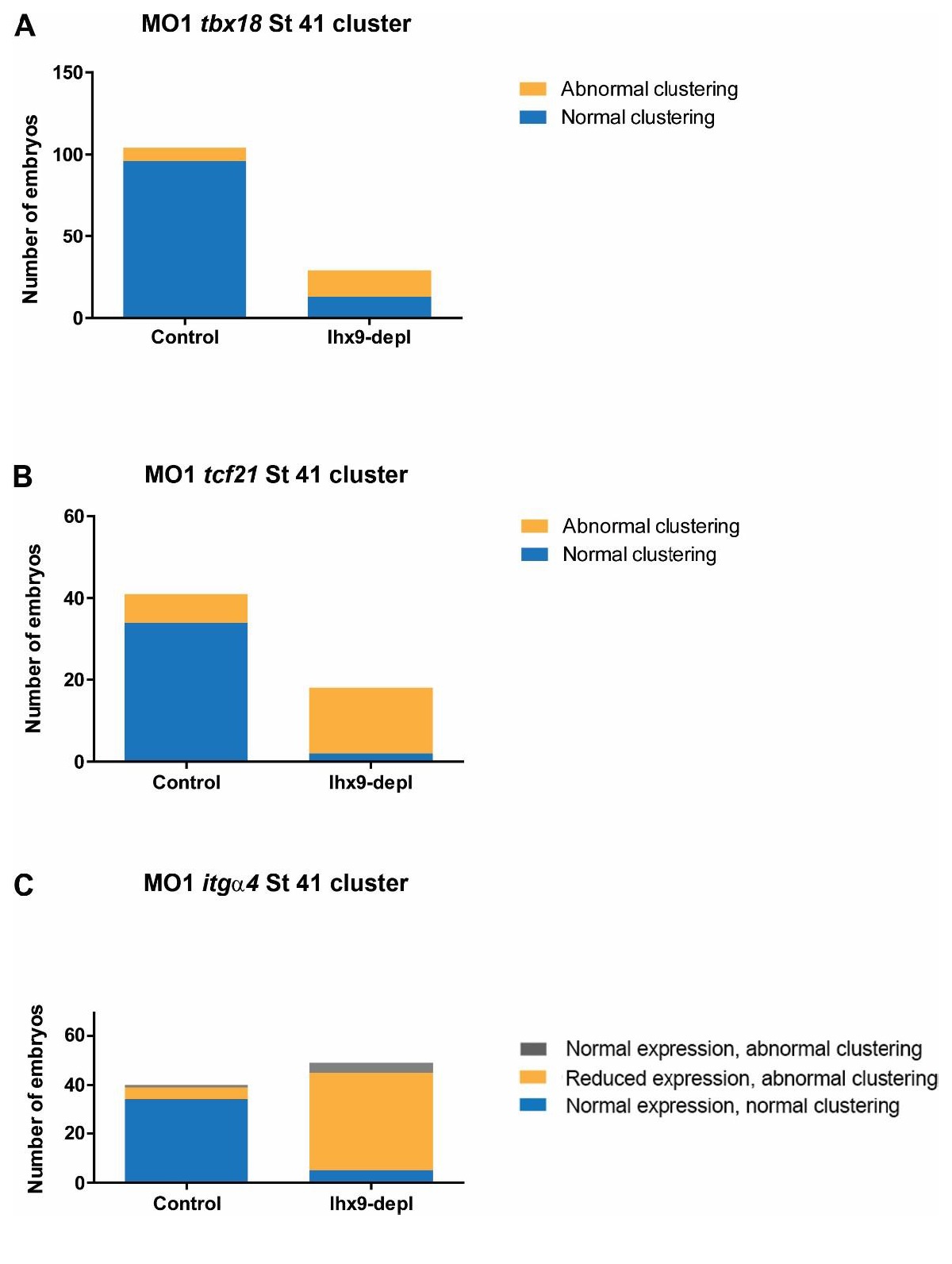 Figure S9. Lhx9 splice-blocking MO depletion strategy gives comparable PE clustering defects to translation-blocking MO. Clustering defects at stage 41 as assessed by (A) tbx18 and (B) tcf21 whole embryo in situ hybridization expression were present in Lhx9-MO1-depleted embryos (Fishers exact test p = <0.0001). (C) Defects observed in itga4 expression and localization was significant by Chi-square test (p = <0.0001) in Lhx9-MO1-depleted embryos. From three independent experiments. |