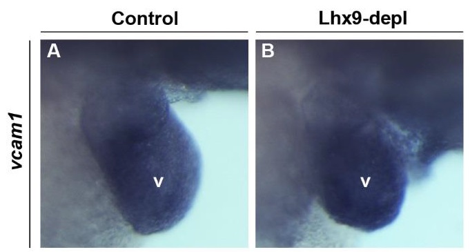 Figure S10. Lhx9 depletion has no obvious effects on vcam1 expression Lhx9-depletion at stage 41(B) did not significantly alter the expression of vcam1 in the heart compared to controls (A) by in situ hybridization, 6 embryos per condition. v; ventricle. Development ⢠Supplementary information |