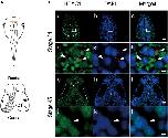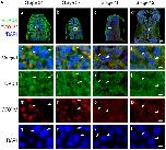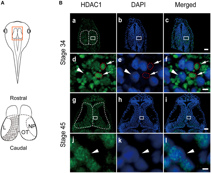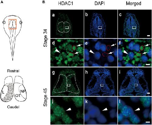 Figure 1. HDAC1 distribution in tectal cells in the developing Xenopus. (A) A cartoon showing the optic tectum at stage 45. The tectum is outlined in red. The brain was fixed and cryosectioned for immunostaining. NP, neuropil; OT, optic tectum; L, lateral. (B) The tectum was sectioned and stained with anti-HDAC1 antibody (green) at stage 34 (Ba–Bc). Scale bar: 50 μm. A higher-magnification image of the tectum is shown below. Scale bar, high magnification: 5 μm. HDAC1 was clearly localized in the organelle showing weak DAPI staining (Bd–Bf, red circles), whereas little HDAC1 was distributed in the DAPI-positive cell nuclei (arrowhead). The subcellular localization of HDAC1 in the organelle was almost absent from the tectum at stage 45 (Bg-Bl). Arrowheads indicate cell nuclei counterstained with DAPI (Bg-Bl).