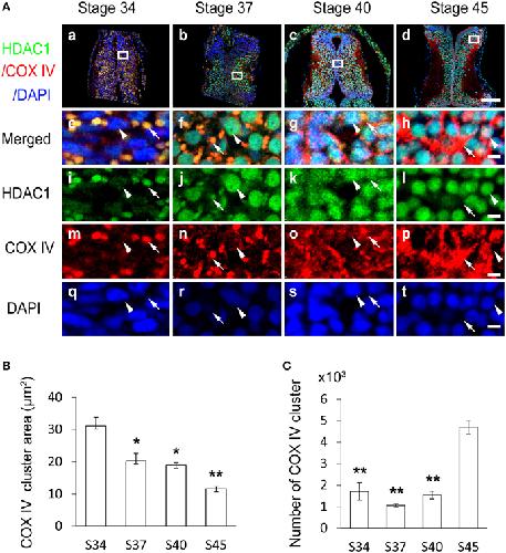 Figure 2. Subcellular distribution of HDAC1 in the developing Xenopus tectum. (A) Representative immunofluorescent images showing merged HDAC1 (green)/COX IV (red)/DAPI (blue) staining in cells of the developing tectum at stages 34 (Aa), 37 (Ab), 40 (Ac), and 45 (Ad). Scale bar: 100 μm. High-magnification images (Ae–At, scale bar: 5 μm) are demarked by white lines and connected to the original figures (Aa–Ad). Arrowheads indicate cell nuclei stained with DAPI, and arrows indicate mitochondria stained for COX IV. HDAC1 distribution is represented by anti-HDAC1 staining. (B) Summary showing that area of mitochondria stained by anti-COX IV antibody was decreased in tadpoles at stages 37, 40, and 45, during the development of the tectum, compared to stage 34 tadpoles. (C) Quantification showing that the number of mitochondria in the tectum was significantly increased at stage 45 compared to stages 34, 37, and 40. N = 3, 3, 3, 3 for stage 34, 37, 40, and 45. *p < 0.05, **p < 0.01.