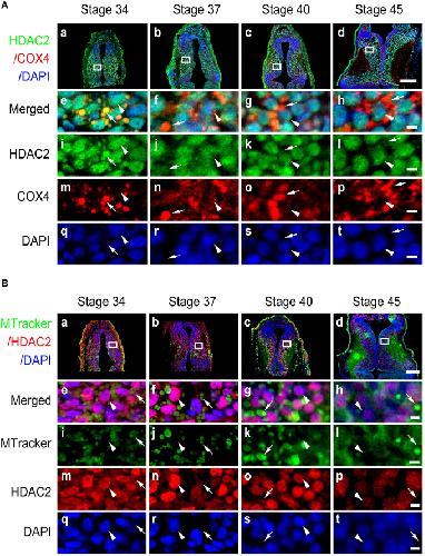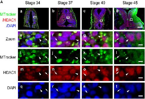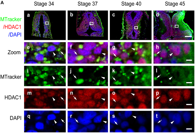 Figure 3. Co-localization of HDAC1 and MitoTracker in developing tectum. (A) Representative co-staining images showing the anti-HDAC1 antibody (red) and MitoTracker (MTracker, green) in stage 34 (Aa), 37 (Ab), 40 (Ac), and 45 (Ad) tecta. Scale bar: 100 μm. High-magnification images (Ae–At, scale bar: 5 μm) are demarked by white lines from the original figures (Aa-Ad). Arrowheads indicate cell nuclei stained with DAPI, whereas arrows indicate mitochondria stained with MitoTracker. Scale bar: 5 μm.