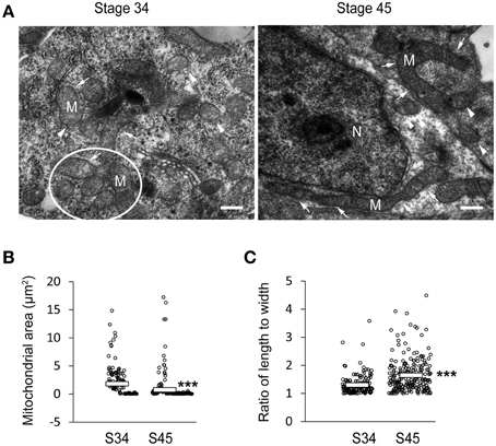 Figure 4. Mitochondrial morphology changes during the development of tectal cells. (A) Tecta at stages 34 (left) and 45 (right) were fixed for electron microscopy. White circle indicate aggregated mitochondria. Arrows indicate elongated mitochondria, whereas arrowheads indicate round/spherical mitochondria. Scale bar: 0.5 μm. M, mitochondria; N, Nucleus. (B) Quantification showing that the area of mitochondria in tecta was significantly decreased at stage 45 compared to stage 34 (Stage 34: 1.82 ± 0.20 μm2, Stage 45: 0.75 ± 0.15 μm2; N = 161, 224). (C) The ratio of mitochondrial length to width was dramatically increased at stage 45 compared to stage 34 (Stage 34: 1.30 ± 0.03, Stage 45: 1.65 ± 0.04; N = 161, 224). ***p < 0.001.