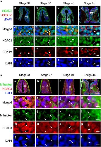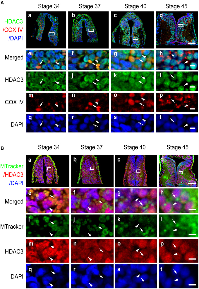 Figure 6. Subcellular distribution of HDAC3 in the developing tectum. (A) Representative immunofluorescent images showing merged HDAC3 (green)/COX IV (red)/DAPI (blue) staining in cells of the developing tectum at stages 34 (Aa), 37 (Ab), 40 (Ac), and 45 (Ad). Scale bar: 100 μm. High-magnification images (Ae–At, scale bar: 10 μm) are demarked by white lines and are connected to the original figures (Aa-Ad). (B) Tecta at stages 34 (Ba), 37 (Bb), 40 (Bc), and 45 (Bd) were stained for HDAC3 (red) with an anti-HDAC3 antibody and counterstained with MitoTracker green. Scale bar: 100 μm. High-magnification images (Be–Bt, scale bar: 5 μm) are demarked by white lines. Arrowheads indicate cell nuclei counterstained with DAPI, whereas arrows indicate mitochondria stained with MitoTracker.