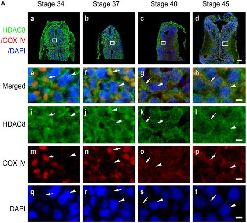 Figure 7. Subcellular distribution of HDAC8 in the developing tectum. (A) Sections of tectum were immunostained for HDAC8 (green), COX IV (red), and DAPI (blue) at stages 34 (Aa), 37 (Ab), 40 (Ac), and 45 (Ad). Scale bar: 50 μm. High-magnification images (Ae–At, scale bar: 5 μm) are demarked by white lines. Arrowheads indicate DAPI-stained cell nuclei, and arrows indicate COX IV-positive mitochondria.