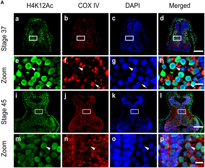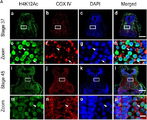 Figure 8. Activity of acetylation in the mitochondria. (A) Tecta at stages 37 (Aa–Ah) and 45 (Ai–Ap) were stained with antibodies against Histone H4 (acetyl K12, H4K12Ac) (green) and the mitochondrial marker COX IV (red). Scale bar: 100 μm. High-magnification images (Ae–Ah, Am–Ap, Scale bar: 10 μm) are demarked by white lines. Arrowheads indicate cell nuclei, and arrows indicate mitochondria.