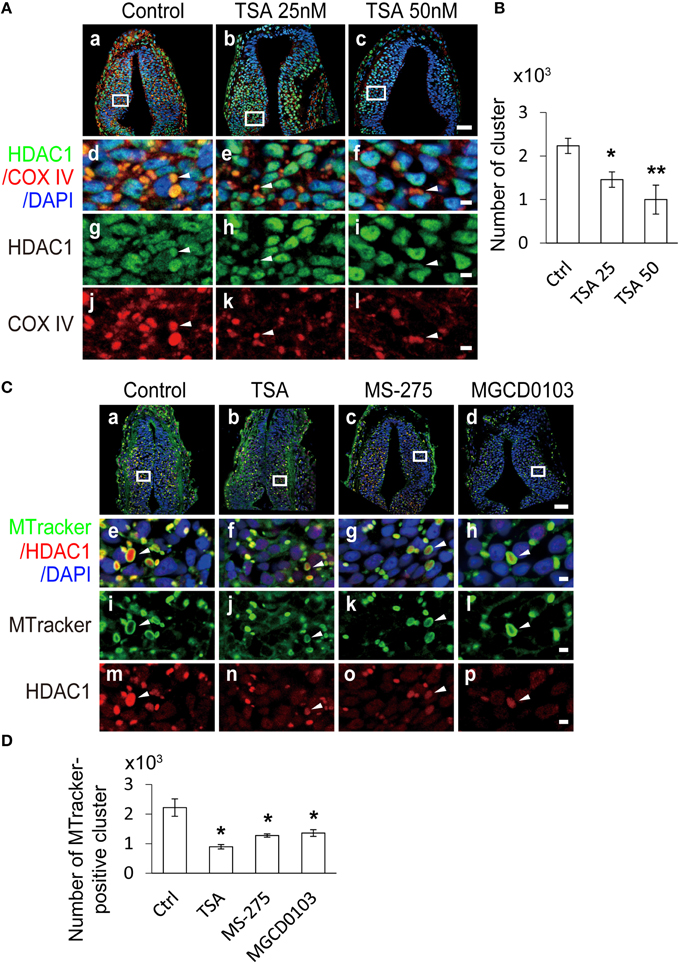 Figure 9. Mitochondrial dynamics are regulated by HDAC inhibitors. (A) Representative images showing changes in mitochondrial dynamics at stage 37 tadpoles. Tecta in the control (Aa), TSA 25 nM (Ab), and TSA 50 nM (Ac) treatment groups were stained for HDAC1 (green), COX IV (red) and DAPI (blue). Scale bar: 50 μm. High-magnification images (Ad–Al, scale bar: 5 μm) are demarked by white lines and are connected to the original figures (Aa–Ac). Arrowheads indicate mitochondria stained for COX IV and HDAC1. (B) Summary showing that the number of mitochondria was dramatically decreased in TSA (25 and 50 nM)-treated animals compared to control tadpoles. N = 6, 5, 4 for Control, TSA 25 nM, and TSA 50 nM. (C) Representative co-staining images showing the anti-HDAC1 antibody (red) and MitoTracker (MTracker, green) after tadpoles were treated with TSA (50 nM, Cb), MS-275 (10 μM, Cc) and MGCD0103 (25 μM, Cd). Scale bar: 50 μm. High-magnification images (Ce–Cp, scale bar: 5 μm) are demarked by white lines from the original figures (Ca–Cd). Arrowheads indicate mitochondria stained with MitoTracker and HDAC1. Scale bar: 5 μm. (D) Quantification showing that the number of mitochondria was dramatically decreased in TSA-, MS-275-, and MGCD0103-treated animals compared to control tadpoles. N = 4, 5, 5, 4 for Control, TSA, MS-275, and MGCD0103. *p < 0.05, **p < 0.01.