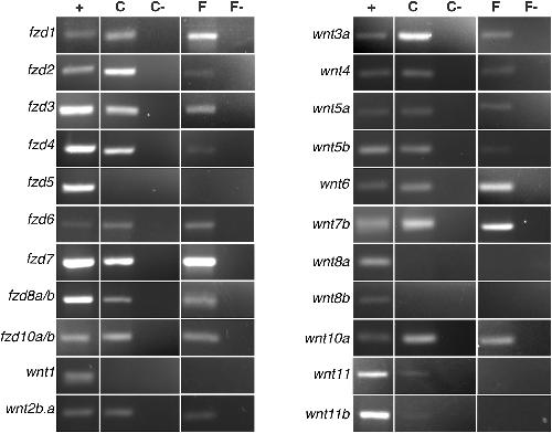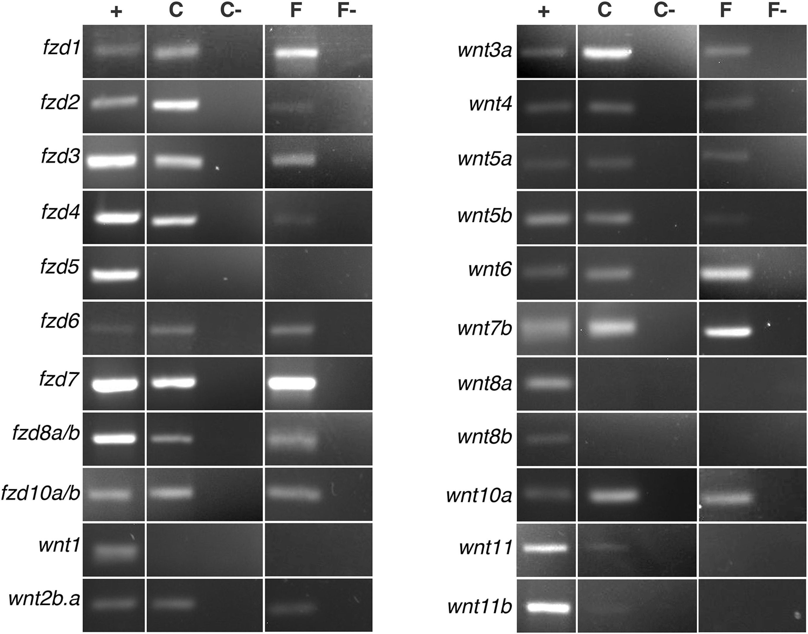 Expression of wnts and frizzled receptors in larval cornea and flank epithelium. RT-PCR was conducted on total RNA isolated from larval corneaepithelium (âCâ) or flank epithelium (âFâ). â+â denotes a positive control from pooled embryonic total RNA. âC-â and âF-â are reverse transcriptase negative controls. Primers and corresponding product sizes are listed in Supplemental Table 1.