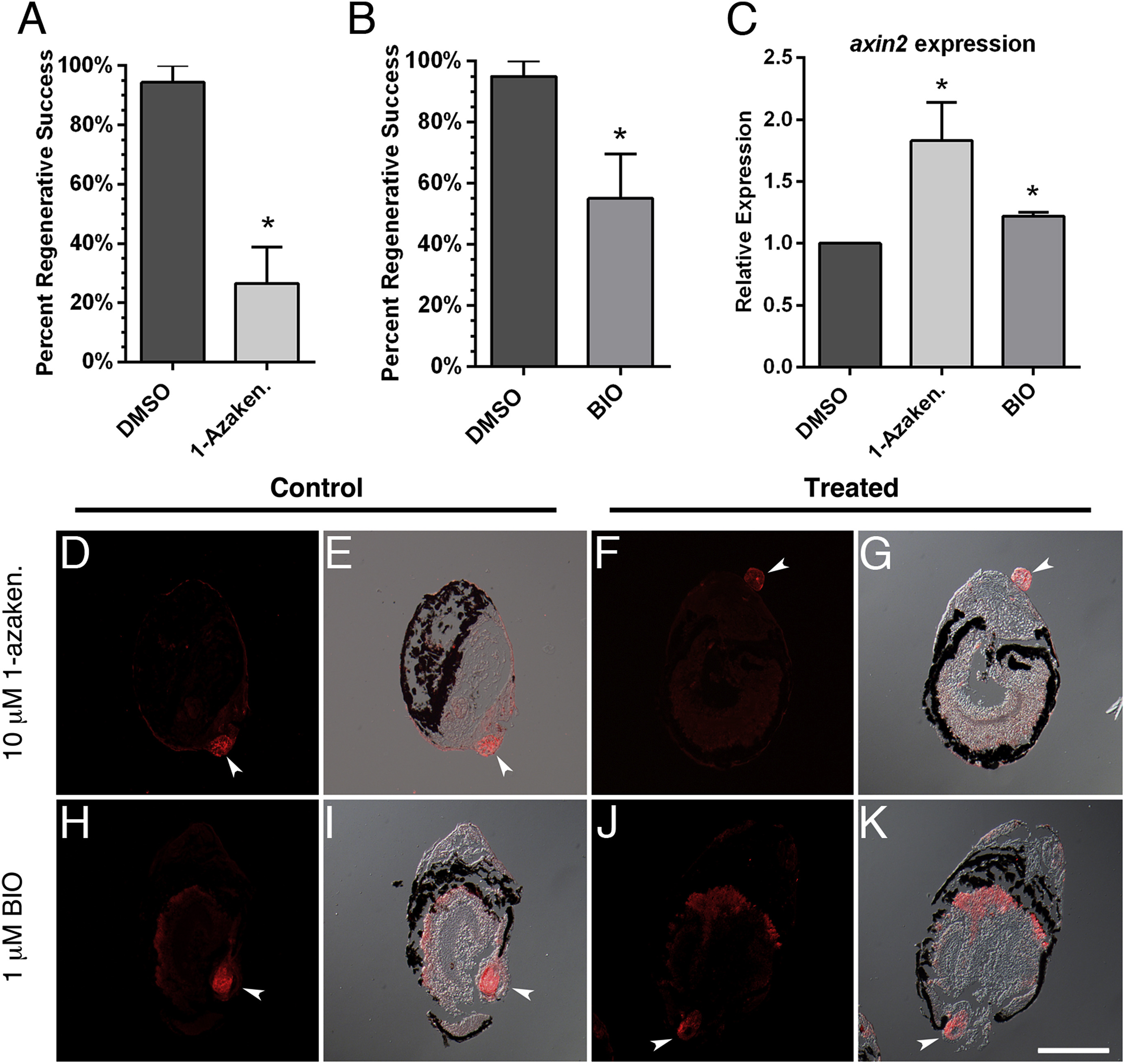 Activation of Wnt signaling reduces successful lens regeneration. Lens regeneration percentages for treatment with Wnt signaling activators, including 10 μM 1-azakenpaullone (A) or 1 μM BIO (B), compared to DMSO treated controls. âPercent Regenerative Successâ refers to the percentage of cases that successfully regenerated based on the presence of morphologically distinct lentoids that were positively stained by an anti-lens antibody. (C) Relative expression levels of axin2 in corneas treated with 10 μM 1-azakenpaullone or 1 μM BIO. Asterisks indicate statistical significance (p < 0.05) and error bars indicate standard error. axin2 expression was normalized to ornithine decarboxylase (odc). (DâK) Representative examples of positive cases of lens regeneration for BIO or 1-azakenpaullone treated eyes. D, F, H, and J show histological eye sections labeled using an anti-lens antibody (red fluorescence). Arrowheads indicate regenerated lenses. Sometimes higher background signal is observed in retinal tissue (H and J), but lenses are easily identified due to their enhanced signaling and distinct morphology. E, G, I, and K show an overlay of anti-lens staining with the corresponding DIC images. Dark tissue is retinal pigment epithelium. All images are at the same scale, scale bar in K is 200 μm.