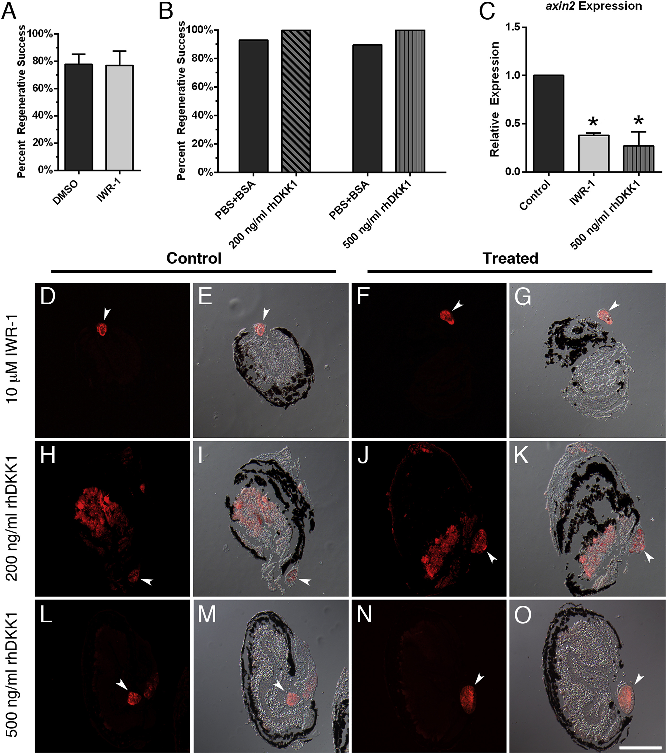 Wnt inhibition has no effect on lens regeneration. Lens regeneration percentages for ex vivo eyes treated with either 10 μM IWR-1 (A) or rhDKK1 protein at either 200 ng/ml or 500 ng/ml (B). âPercent Regenerative Successâ refers to the percentage of cases that successfully regenerated based on the presence of morphologically distinct lentoids that were positively stained by an anti-lens antibody. Neither of these experiments showed statistically significant differences. (C) Both IWR-1 and rhDKK1 treatment significantly decreased axin2 transcriptional levels in treated corneatissue, verifying the Wnt inhibitors had the desired effect on Wnt signaling. Asterisks indicate statistical significance (p < 0.05), and error bars indicate standard error. axin2 expression was normalized to ornithine decarboxylase (odc). (DâO) Representative examples of positive cases of lens regeneration for IWR-1 or rhDKK1 treated eyes. D, F, H, J, L, and N show fluorescent (red) labeling of histological eye sections using an anti-lens antibody. Arrowheads indicate regenerated lenses. Sometimes higher background signal is observed in retinal tissue (H and J), but lenses are easily identified due to their enhanced signal and distinct morphology. E, G, I, K, M, and O show anti-lens staining overlaid with the corresponding DIC images. Dark tissue is retinal pigment epithelium. All images are at the same scale, scale bar in O is 200 μm.