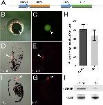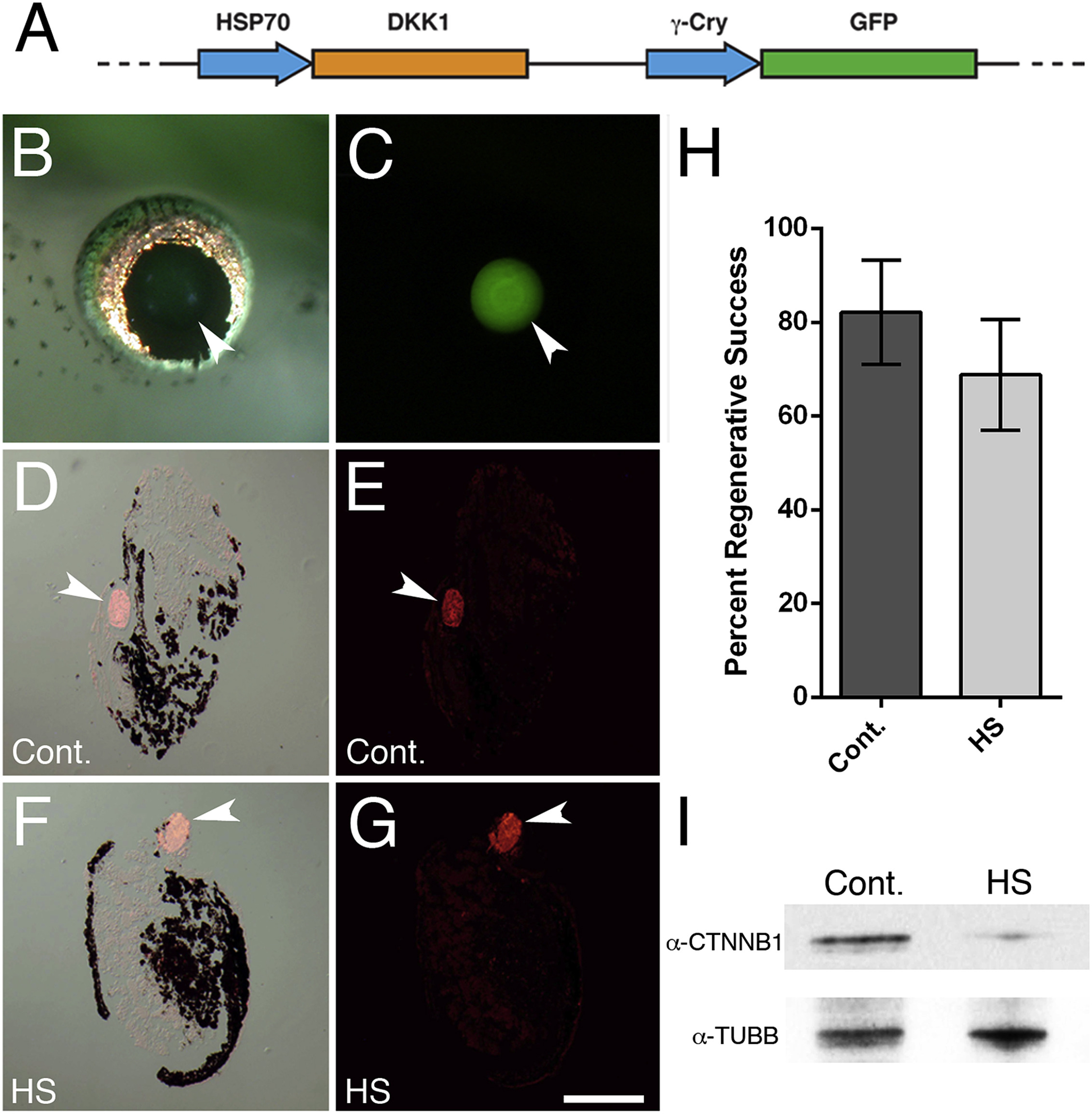 Transgenic expression of DKK1 does not inhibit lens regeneration. (A) A diagram of the HGEM-DKK1 bi-cistronic transgene. The heat-shock inducible hsp70 promoter drives expression of Xenopus DKK1, and a gamma-crystallin promoter drives GFP expression specific to the lens. (BâC) HGEM-DKK1 transgenic eye showing constitutive expression of GFP in the lens (C). (D-G) Anti-lens antibody staining of regenerated lenses in a sectioned control eye kept at room temperature (âCont.â, D and E) and a heat-shocked eye (âHSâ, F and G). Arrowheads indicate regenerated lenses. Dark tissue in DIC images is retinal pigment epithelium (D and F). All images are at the same scale, scale bar in G is 200 μm. (H) Regeneration percentages of HGEM-DKK1 eyes are not significantly different (p = 0.3706). âPercent Regenerative Successâ refers to the percentage of cases that successfully regenerated based on the presence of morphologically distinct lentoids that were positively stained by an anti-lens antibody. Error bars represent standard error. (I) Depletion of β-catenin (CTNNB1; 94 kDa) in western blots of HGEM-DKK1 transgenic tissue. β-tubulin (TUBB; 50 kDa) is the loading control.
