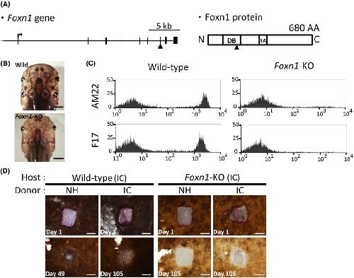 Figure 4. Characterization of the Foxn1-knockout tadpoles. (A) The target sites of anti-Foxn1 TALEN in Foxn1 genomic gene and Foxn1 protein. The alignment is labeled as described in the legend to Fig. 2. (B) Photographs of heads of stage 56 wild-type and Foxn1-knockout tadpoles. Arrowheads indicate the thymus in the wild-type tadpole. There is no thymus in the Foxn1-knockout tadpole. Scale bars = 3 mm. (C) Flow cytofluorometric analysis of splenocytes from wild-type and Foxn1-knockout frogs after staining with mouse anti-CD8 monoclonal antibody (AM22 or F17) and Alexa Fluor 488 goat anti-mouse IgM antibody. (D) Transplantation of ventralskin grafts from wild-type Nigerian H (NH) and Ivory Coast (IC) strains to the backs of IC wild-type and Foxn1-knockout frogs. Note that both grafts survived on the back of Foxn1-knockout frog for more than 100 days. Scale bars = 1 mm.
