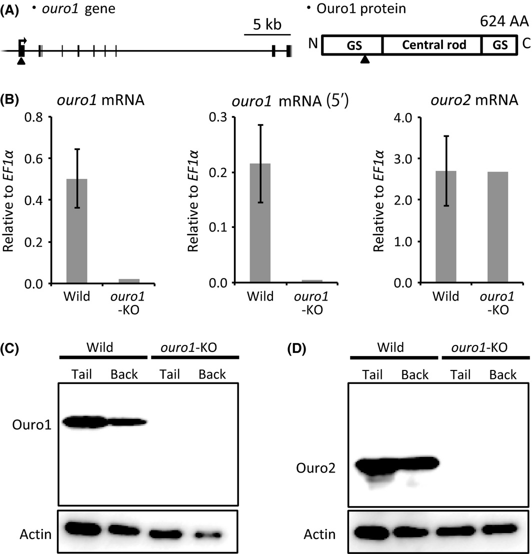 Figure 2. Characterization of the ouro1-knockout tadpole. (A) The target sites (arrowheads) of anti-ouro1 TALEN in ouro1 genomic gene and Ouro1 protein. The black boxes and the arrow indicate exons and the transcriptional direction, respectively. (B) Expression levels of ouro1 and ouro2 mRNA in the tailskin of stage 60 wild-type and ouro1-knockout tadpoles. Levels of ouro1 mRNA were determined using a pair of primers downstream and another pair of primers (5â²) upstream of the TALEN target sites. Data from wild-type tadpoles are expressed as the means ± SEM (N = 6). (C, D) Expression levels of Ouro1 (C) and Ouro2 (D) proteins in the tail and back skin of stage 60 wild-type and ouro1-knockout tadpoles.