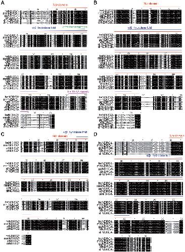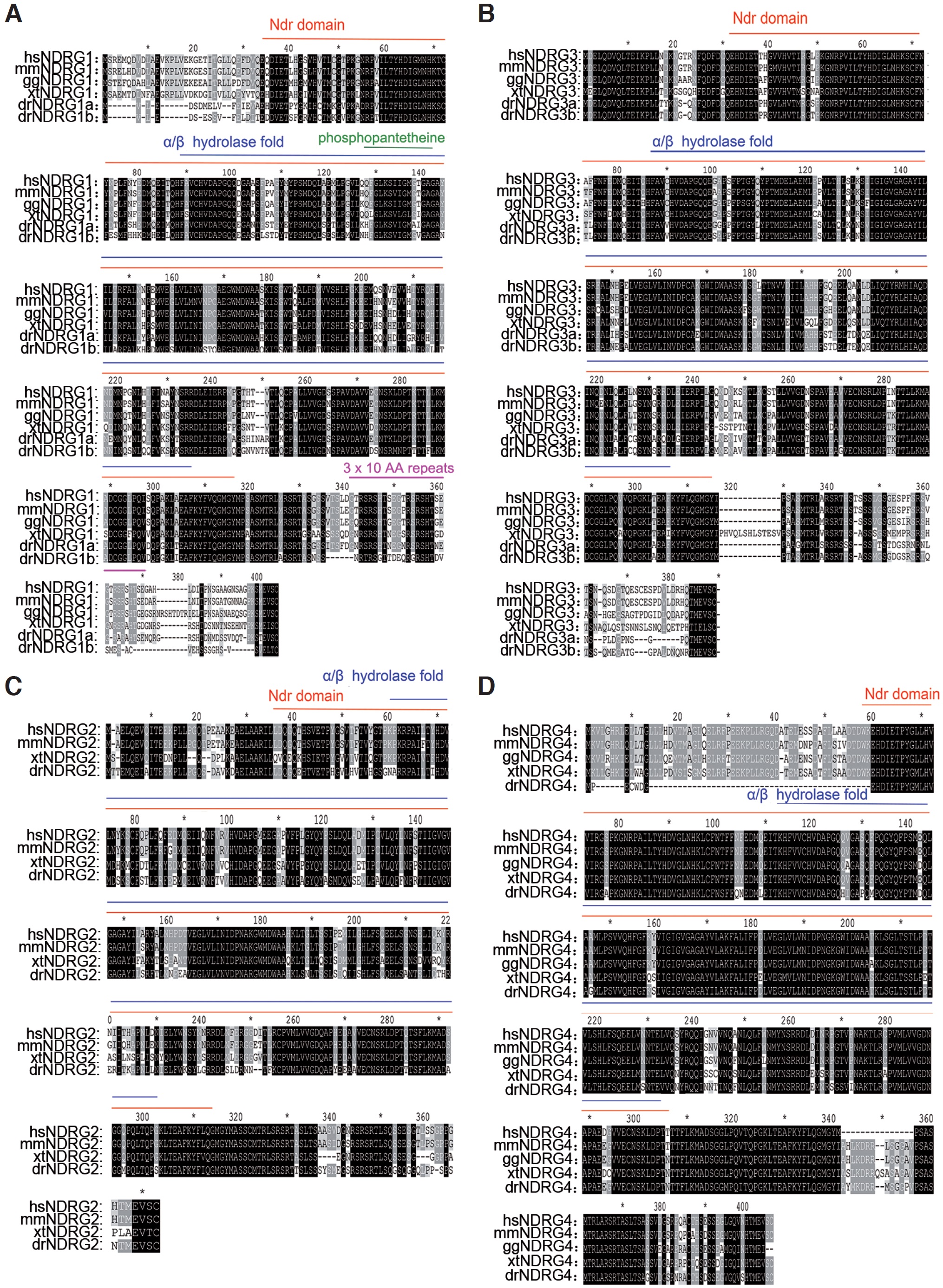 Fig. 1. Amino acid sequences alignment of the Ndrg genes. (A-D) Amino acid sequences of Ndrg1, 2, 3, and 4 from different vertebrates were aligned respectively. Amino acid sequences were collected from human (Homo sapiens), mouse (Mus musculus), chicken (Gallus gallus), frog (Xenopus tropicalis), and zebrafish (Danio rerio). Identity residues from zebrafish to mammals are shown in black, and similarity sites are shown in gray. The red, blue, green and pink lines indicate Ndr domain, a/b hydrolase-fold motif, phosphopantetheine site and 3×10 AA (GTRSRSHTSE) tandem repeats, respectively. Abbreviations: hs (Homo sapiens), mm (Mus musculus), gg, (Gallus gallus), xt (Xenopus tropicalis), dr (Danio rerio).