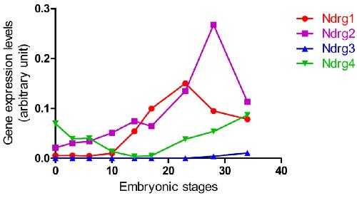 Fig. 3. The temporal expression patterns of Ndrg1, 2, 3 and 4 during Xenopus tropicalis embryogenesis. qRT-PCR analysis of relative expression levels of Ndrg1, 2, 3 and 4 at eggs (stage 0), cleavage stage (stage 3 and 6), gastrula stage (stage 10), neurula stage (stage 14 and 17), early tailbud stage (stage 23 and 28) and late tailbud stage (stage 34).