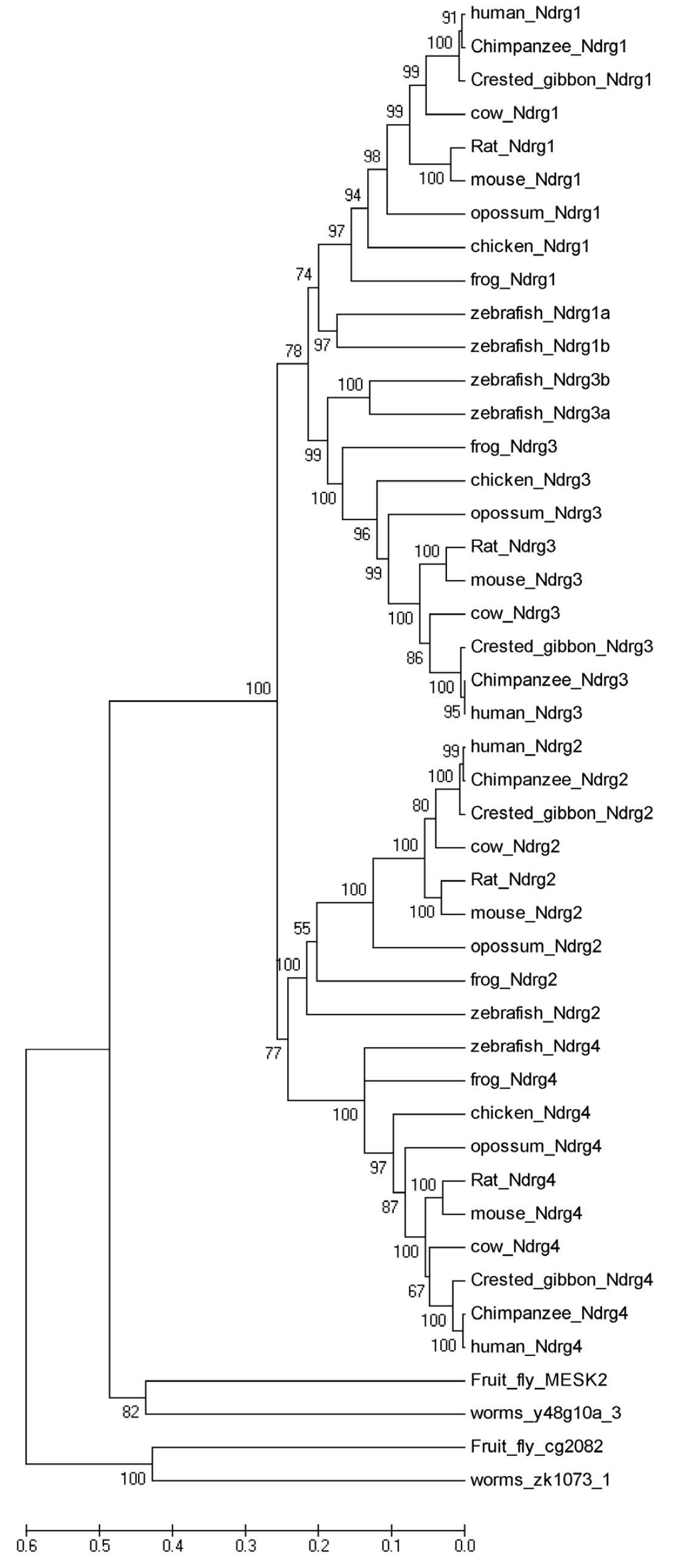 Fig. 2. Phylogenetic tree of the Ndrg genes. The CDSs of the Ndrg genes were obtained from human (Homo sapiens), chimpanzee (Pan troglodytes), gibbion (Nomascus leucogenys), cow (Bos taurus), rat (Rattus norvegicus), mouse (Mus musculus), opossum (Monodelphis domestica), chicken (Gallus gallus), frog (Xenopus tropicalis), zebrafish (Danio rerio), fruit fly (Drosophila melanogaster), and worm (Caenorhabditis elegans). NJ based phylogenetic tree was constructed by MEGA5 software. Numbers on branch nodes are bootstrap replication values. The scale bar represents the number of amino acids substitutions.