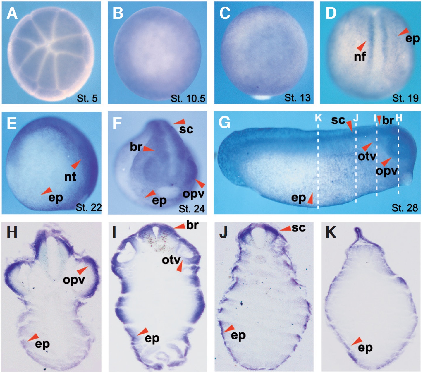 Fig.5. The spatial expression pattern of Ndrg2 during Xenopus tropicalis embryogenesis. (A,B) Animal view. (C,D) Dorsal view, anterior to the top. (E,G) Lateral view, dorsal to the top and anterior to the right. (F) Anterior view, dorsal to the top. (H-K) Transverse paraffin sections of stage 28 embryos after WISH. Abbreviations: br (brain), ep (epidermis), nf (neural fold), nt (neural tube), opv (optic vesicle), otv (otic vesicle), sc (spinal cord).
