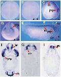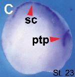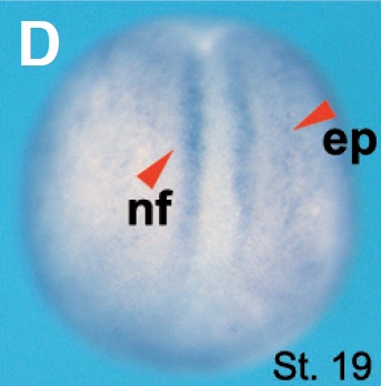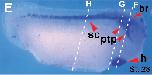 Fig. 6 (Left). The spatial expression pattern of Ndrg3 during Xenopus tropicalis embryogenesis. (A,B) Animal view. (C,E) Lateral view, dorsal to the top and anterior to the right. (D) Anterior view, dorsal to the top. (F-H) Transverse paraffin sections of stage 28 embryos after WISH. Abbreviations: br (brain), h (heart), ptp (profundal and trigeminal placodes/ganglia), otv (otic vesicle), sc (spinal cord).