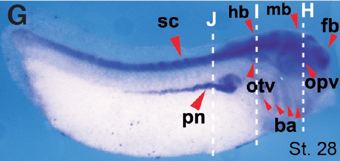 Fig. 7 (Right). The spatial expression pattern of Ndrg4 during Xenopus tropicalis embryogenesis. (A,B) Animal view. (C,D) Dorsal view, anterior to the top. (E) Anterior view, dorsal to the top. (F, G) Lateral view, dorsal to the top and anterior to the right. (H-J) Transverse paraffin sections of stage 28 embryos after WISH. Abbreviations: ba (branchial arch), fb (forebrain), mb(midbrain), hb (hindbrain), opv (optic vesicle), otv (otic vesicle), sc (spinal cord), pn (pronephros).