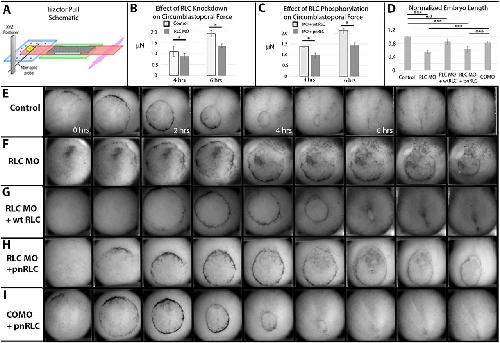 Reduced convergence forces affect whole embryo morphology. (A) Schematic of the âtractor-pullâ device to measure convergence forces. Explants made from RLC morphant embryos generate less pulling force than controls (B) and co-expressing wtRLC but not pnRLC rescues these pulling forces (C) as measured in sandwich explants at 4 and 6â
