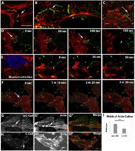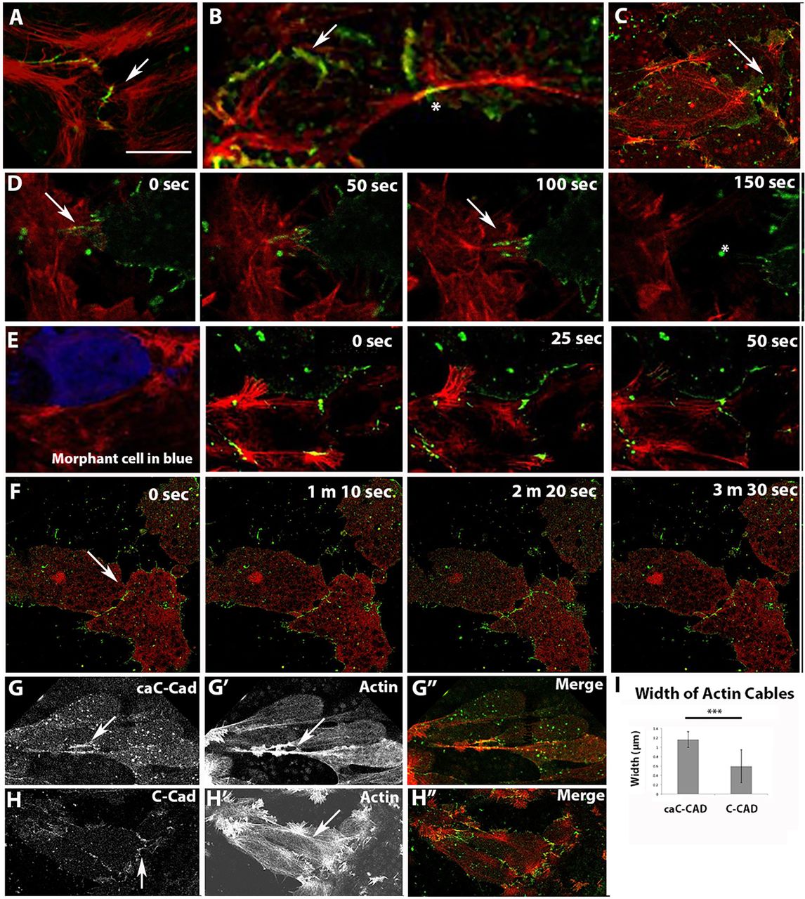 C-cadherin localization on lamellipodia depends on RLC. Actin is red and C-cadherin or caC-cadherin is green. (A,B) Cadherin forms puncta (arrow) on lamellipodia (A) that resolve into long plaques (arrow), linking actin cables from neighboring cells (B, asterisk). (C) By contrast, lamellipodia on RLC morphant cells maintain a cloud of diffuse C-cadherin signal (arrow) that does not resolve into puncta. (D) Time-lapse microscopy of C-cadherin dynamics in adjacent control cells labeled singly for actin (left) or C-cadherin (right) display adhesions (arrows) that when broken, snap backwards rapidly (asterisk). (E) RLC MO-treated cells (co-injected with a blue dextran) do not make adhesions with neighboring control cells. (F) pnRLC-expressing morphant cells display little protrusive activity or adhesion remodeling (arrow). (G-I) Cells expressing caC-cadherin exhibit longer linear adhesion plaques than C-cadherin-expressing cells (arrows in G,H), which are associated with thicker actin cables (arrow in Gâ², quantified in I; n=20 widths per condition). Merged images are in Gâ²,Hâ². Scale bar in A is 20â