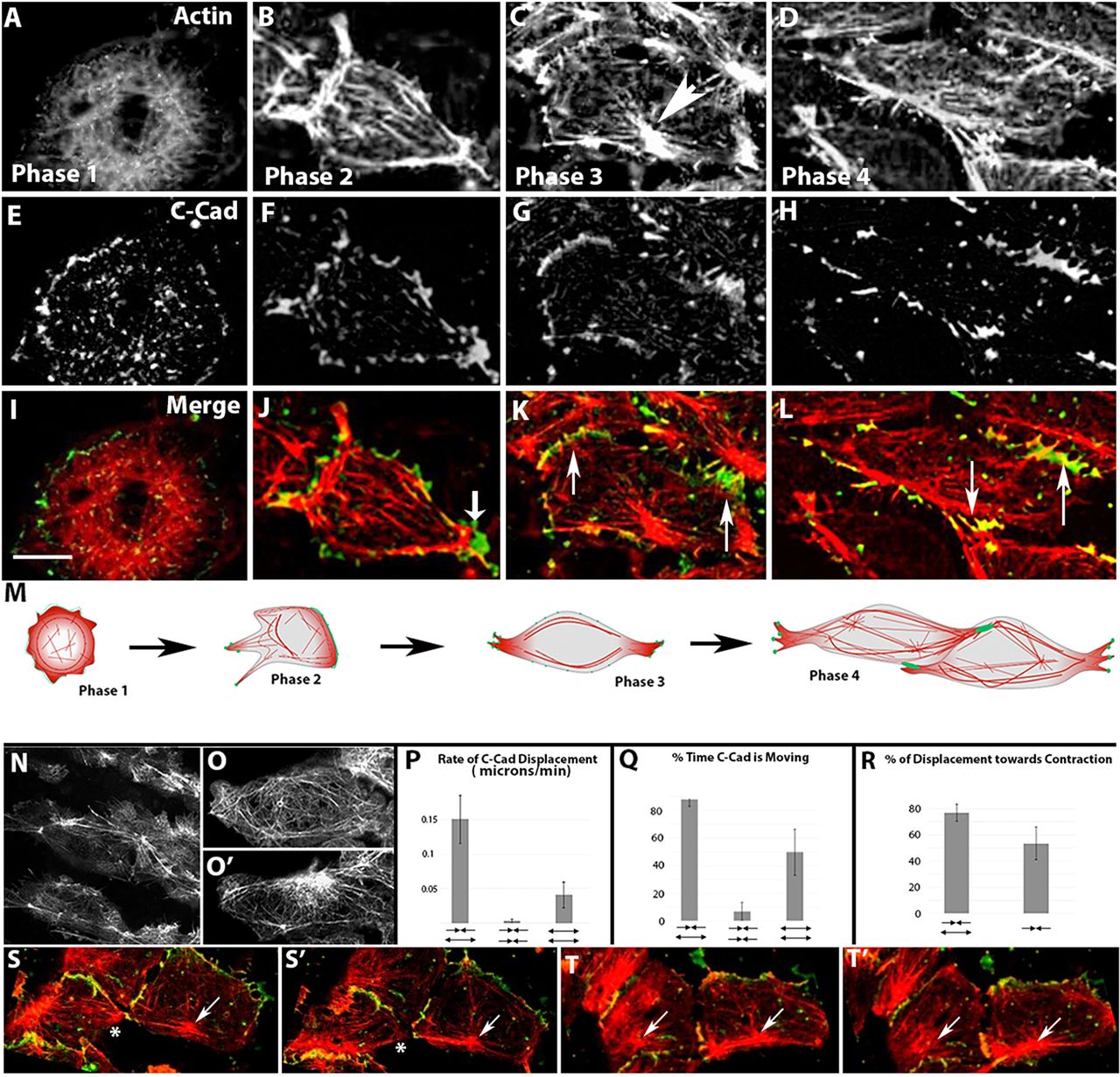 Actin and C-cadherin dynamics during mediolateral intercalation behavior. Representative images of actin organization (A-D), C-cadherin distribution (E-H) and double-labeling (red, actin; green, C-cadherin) (I-L) in cells in dorsal marginal zone explants during the four phases of MIB (M). Scale bar: 20â