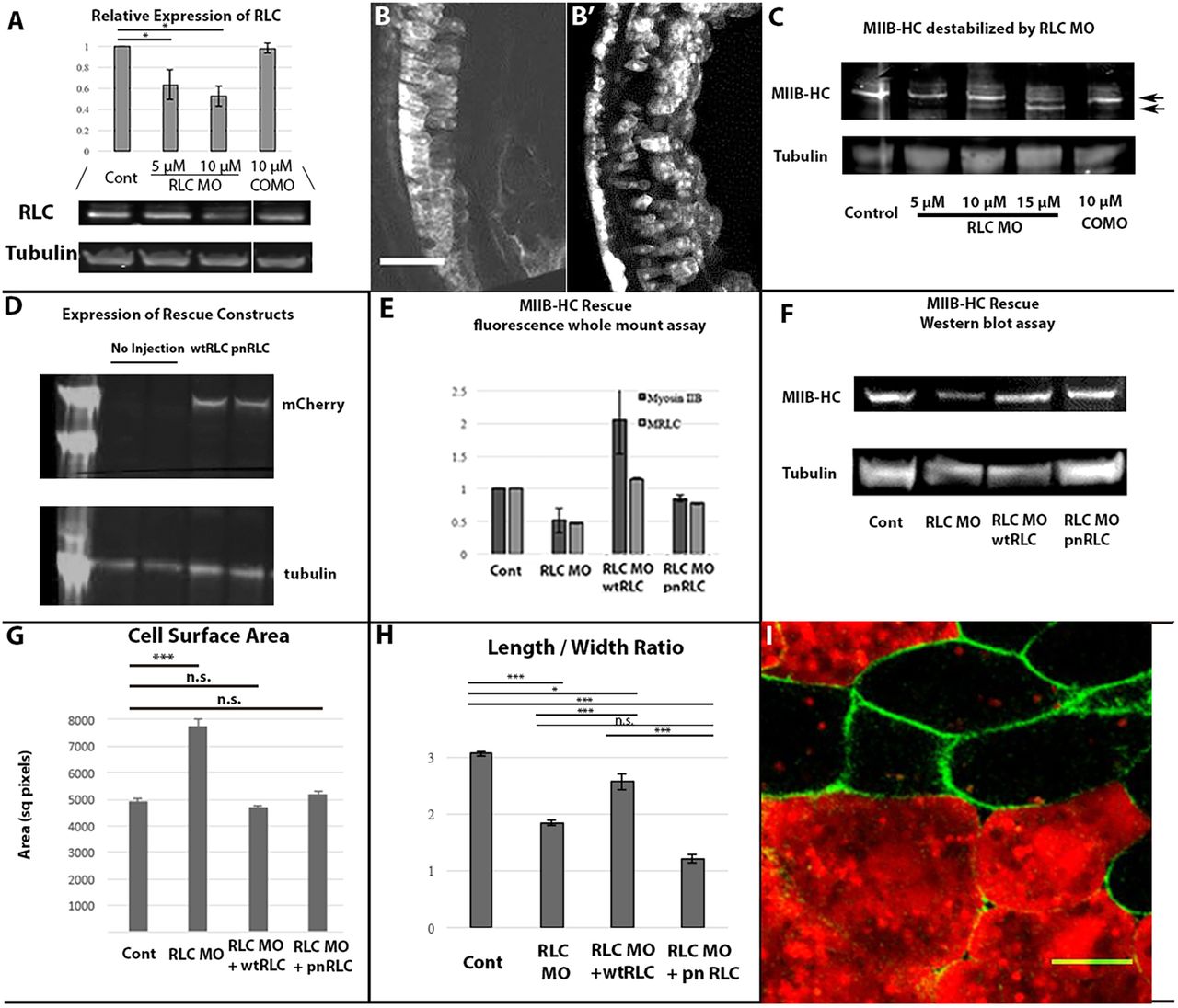 μm Z-projections of stacks by means of co-injected fluorescent Rhodamine-dextran reveals a cell shape dependence on RLC levels. (C) Myosin IIB heavy chain levels exhibit an RLC MO dose-dependent decrease associated with an increase in proteolytic degradation. (D) Injecting wtRLC-mCherry or pnRLC-mCherry mRNA into developing embryos leads to protein expression as detected by anti-mCherry antibody. (E,F) Two methodologies show that wtRLC and pnRLC expression rescues MHC-IIB stability; quantification of RLC and myosin IIB immunofluorescence levels in RLC morphant dorsal marginal zone explants (E; n=7 explants/condition) and western blot analysis of myosin IIB heavy chain levels in RLC MO embryos (F). (G) RLC morphant cells have a larger surface area than control cells in explants and this phenotype can be rescued by either wtRLC or pnRLC expression (n is at least 52 cells/condition). (H) However, RLC morphant cells have a reduced length-to-width ratio. Expression of wtRLC but not pnRLC substantially rescued this cell shape phenotype (n, at least 14 cells/condition). (I) Morphant cells expressing pnRLC labeled with Rhodamine-dextran (red) display lower length-to-width ratios than corresponding control cells (green). Error bars represent s.e.m. Cont, control. Scale bar: 100 μm in B and 20 μm in I.