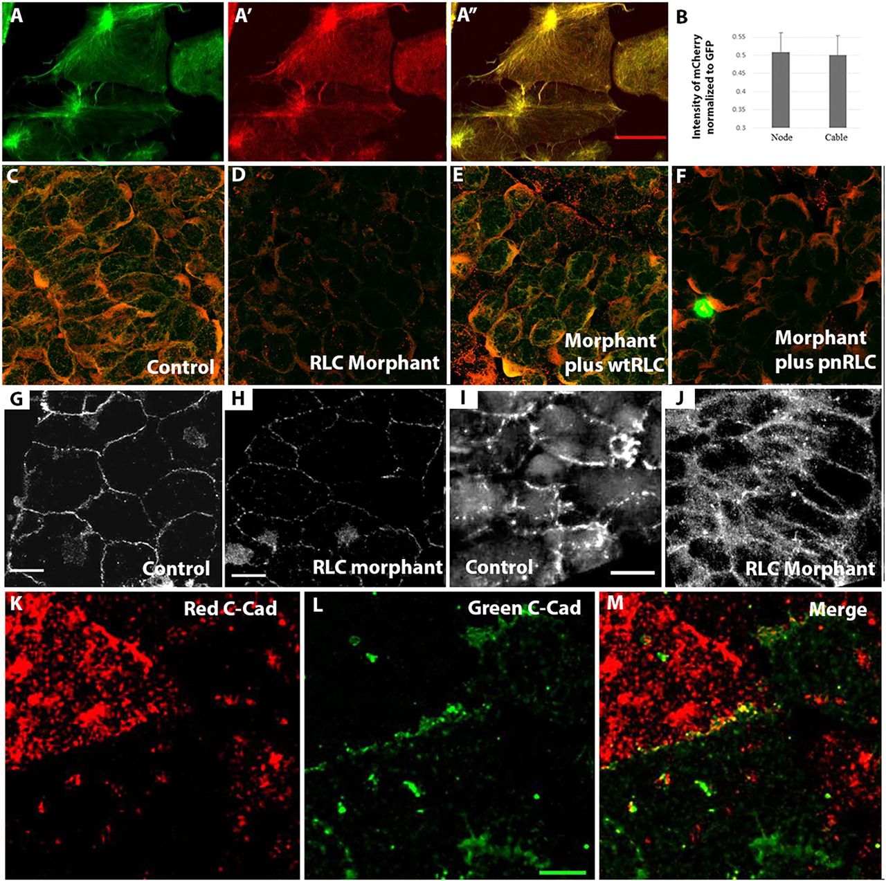 Colocalization and interdepencies of transcellular array components. (A,B) Imaging of F-actin with moe-GFP (A) and RLC with wtRLC-mCherry (Aâ²) shows colocalization (Aâ²) in both node-and-cable structures with the same relative concentrations in both (B; n=8 regions of interest). (C) Both pRLC and MHC localize to cell cortices in stage 13 explants using both MHC-IIB (red) and mono-phosphorylated RLC (green) (S19-P) antibodies. Levels of both are reduced in RLC morphants (D), and rescued by expression of wtRLC (E), whereas pnRLC expression rescues heavy chain IIB but not pRLC levels (F). At both stage 10 (G,H) and stage 12 (I,J), C-cadherin localization by immunostaining is perturbed in RLC morphant cells (H). Expression of red (K)- and green (L)-labeled C-cadherin in neighboring cells reveals that they colocalize at the membrane (yellow in M), as expected if they have a role in adhesion. Scale bars: 20 µm in A*,G-I and 10 µm in L.