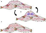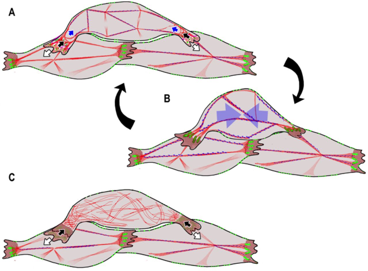 Summary of the roles of myosin II contractility, actin cytoskeleton and C-cadherin dynamics in generating the convergence force driving cell intercalation during CE. (A) Deep dorsal mesodermal cells extend large filo-lamelliform protrusions in the medial and lateral directions (white arrows), a protrusive activity characterized by a diffuse actin network (red cross-hatching). These attach to neighboring cells by de novo formation of small, nascent C-cadherin puncta (bright green). As the actin network undergoes retrograde flow toward the cell body, it coalesces into a series of intersecting arcs, called âproto-nodesâ (black arrows), which mature into a characteristic ânode-and-cableâ actin cytoskeleton spanning the cell body (red cables and intersections). (B) The node-and-cable system undergoes a mediolaterally oriented, actomyosin-mediated contraction (blue arrows, A,B), thereby generating tension that shortens the cell, exerts traction on the neighboring cells, drives mediolateral cell intercalation, and generates a tissue-level, tensile convergence force. This mechanism consists of two interlinked and iterated molecular cycles, first an adhesion cycle (A) consisting of nascent, C-cadherin plaques arising on polarized lamellipodia, which mature into larger, linear actin containing plaques that link the cytoskeletons of individual cells together in a tissue-level system in a contraction-dependent manner, and second, a cytoskeletal cycle (B) consisting of a mediolaterally oriented tension-generating actomyosin contraction. Both cycles are dependent on a contractile myosin II complex (blue arrows in A,B), as the maturation of cadherin puncta into mature adhesion plaques, the maturation of the protrusive cytoskeleton into protonodes and those into the polarized node-and-cable system; all fail in RLC morphants (C).