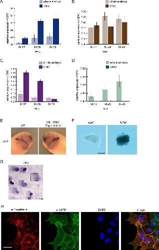 RT-qPCR with different tissue marker genes were used to verify the identity of CNCtissue. CNC explants were dissected at the indicated stages. All values were normalized and calibrated to ODC expression (expression of ODC gene = 1). The bars indicate mean value with standard deviation of at least three independent experiments. CNC specific marker gene (A) twist, (B) snail and (C) slug were present in high abundance in CNC samples throughout all three stages. In the same amount of assessed RNA, the expression of twist as well as that of slug is strongly enriched in CNC sample than in whole embryo sample, whereas the expression of snail did not show this kind of enrichment. (D) The expression levels of the mesoderm marker bra in the CNC samples are barely detectable. (E) In situ hybridization (ISH) for eya1 indicates that placodal tissue is not disturbed when CNC was removed. Scale bar: 200 μm. (F) ISH for eya1 and PCNS on dissected CNC display that the explanted CNC are not contaminated with placodes. Scale bar: 100 μm. (G) ISH for AP2 on several different CNC explants. Scale bar: 200 μm. (H) Immunofluorescence staining of endogenous E-cadherin on CNC explants shown and indicated by the square in (G). CNC cells were labelled with membrane GFP (mbGFP) and explanted on a fibronectin-coated surface. DAPI staining was used to visualize cell nuclei. E-cadherin is prominently localized at cell-cell contacts. Scale bar: 20 μm.