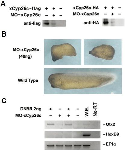 Fig. 4. Inhibition of normal head and axis formation by depletion of endogenous xCyp26c. Morpholino activity was confirmed by Western blot. (B) Embryos injected with 40 ng of MO-xCyp26c did not have head structures and had short axis formation. (C) xCyp26c was injected with DNBR and animal caps were cultured to stage 24. Expression patterns of Otx2 and HoxB9 were analyzed by RT-PCR.