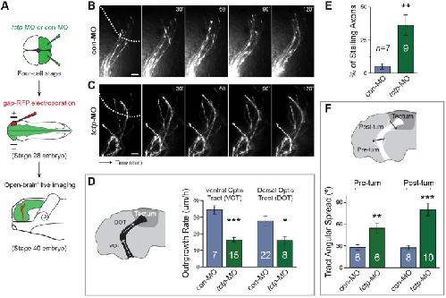 Fig. 4. Tctp deficiency impairs axon extension in vivo. (A) Schematic of the experiment. con-MO-injected or tctp-MO-injected stage 28 embryos were electroporated with gap-RFP to label retinal axons and allowed to develop until stage 40 before in vivo brain imaging. (B,C) Representative time-lapse images of gap-RFP-labelled control (top) and Tctp-depleted (bottom) RGC axons coursing through the optic tract. Dotted lines approximate the boundary of the optic tectum. (D) Average extension rates measured from time-lapse recordings of RGC axons coursing through the ventral optic tract (VOT) and dorsal optic tract (DOT) in controls and Tctp morphants. VOT, ***P<0.0001; DOT, *P<0.0273. (E) Percentage of axons with stalled progression in the control and morphant backgrounds. **P<0.0035. (F) Retinotectal projection angular spreads in controls and Tctp morphants. Pre-turn, **P<0.0082; post-turn, ***P<0.0001. (D-F) Mean±s.e.m.; n, number of axons (D) or embryos (E,F) analysed; unpaired t-test. Scale bars: 25 μm. |