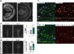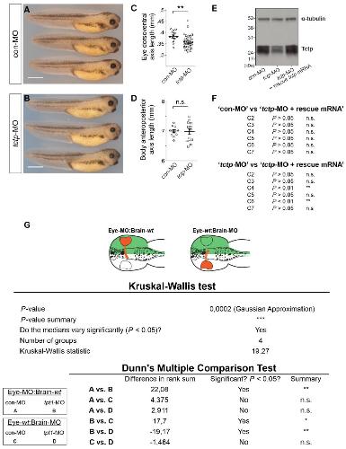 Figure S2. Morphological characterization of Tctp knockdowns. (A and B) Micrographs of stage 39 con-MO- or tctp-MO-injected embryos. Albeit with smaller eyes, Tctp morphants appear morphologically normal, and their development progresses at comparable rates relative to con-MO-injected tadpoles. (C) Plot of eye size measurements (mean ± SEM; ** P < 0.0063, unpaired t-test). (D) Plot of body length (anteroposterior axis) measurements (mean ± SEM; n.s. P < 0.8614, unpaired t-test). (E) The normalization of Tctp protein expression levels was evaluated by Western blot after a morpholino-resistant tctp transgene was co-injected with tctp-MO. Protein extracts were prepared from stage 37/38 embryos. (F) Complements Fig. 2I: Summary of the statistical analysis examining the effect of normalizing Tctp expression levels on the development of Tctp-depleted projections. (G) Complements Fig. 3D-H: Summary of the statistical analysis performed to evaluate the impact of Tctp deficiency on the length of the retinotectal projection. Scale bars: 110 μm. |