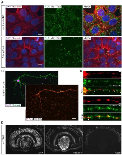 Figure S6. Axonal Tctp interacts with pro-survival Mcl1. (A) PLA signal (green) obtained using anti-Tctp and anti-Mcl1 sera in control- or tctp-shRNA-infected HCT116 cells, counterstained with DAPI (blue) and phalloidin (red). (B) PLA signal obtained using anti-Tctp and anti-Mcl1 sera in cultured rat cortical neurons (E18.5 + 14 DIV), counterstained with DAPI and phalloidin. (C) PLA signal obtained using anti-Tctp and anti-Mcl1 sera in cultured rat cortical neurons (E18.5 + 3 DIV), counterstained with MitoTracker. Arrowheads denote PLA positive puncta co-localizing with mitochondria. The bottom three panels are centred on a distal region of the neurite. The data indicates that approximately 5-10% of Tctp-Mcl1 PLA puncta co-localize with mitochondria in neurites. This is in agreement with observations by Yang and colleagues who found by immunocytochemistry means that Tctp and Bcl-XL partially co-localize not only in mitochondria but also in the cytosol (Yang et al., 2005). It is noteworthy that while anti-apoptotic Bcl-2 family proteins are generally integrated within the outer mitochondrial membrane, they can also be found in the cytosol or in the endoplasmic reticulum membrane (Chipuk et al., 2010). Furthermore, pro-apoptotic Bax, whose homodimerization in the outer mitochondrial membrane is prevented by Tctp (Susini et al., 2008), is usually cytosolic (Chipuk et al., 2010). Likewise, the cellular localization of Tctp is mainly cytoplasmic in healthy cells (Bommer and Thiele, 2004; Gachet et al., 1999; Yang et al., 2005). One possibility is that Tctp shuttles between the cytosol and the outer mitochondrial membrane in non-apoptotic conditions. (D) Stage 43 Mcl1-depleted retina probed with anti-Opsin antibody, counterstained with phalloidin and DAPI. Signs of morphological disruption were not detected on examination of the retina in Mcl1 morphants, suggesting that the mcl1-MO does not elicit widespread toxicity. Scale bars: 5 μm in (A), 10 μm in (B) and (C), 50 μm in (D). |