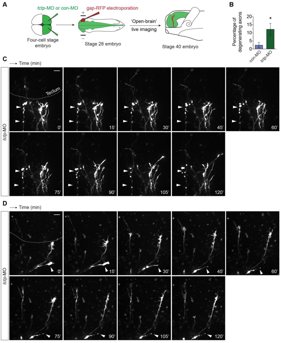 Figure S7. Degenerating retinal ganglion cell axons in Tctp morphant projections. (A) Schematic representation of the experiment. con-MO- or tctp-MO-injected stage 28 embryos were electroporated with gap-RFP to label retinal axons and allowed to develop until stage 40 before in vivo brain imaging. (B) Percentage of retinal ganglion cell axons classified as degenerating in controls and Tctp morphants (mean ± SEM; n = no. of axons analysed; * P < 0.0418, unpaired t-test). (C) Time-lapse images of Tctp-depleted retinal ganglion cell axons coursing through the optic tract. Dashed lines indicate the boundary of the optic tectum. Arrowheads indicate a degenerating axon, as suggested by its beaded morphology. Note that this axon has not yet reached the optic tectum; thus, it is unlikely that such effect is elicited by normally occurring pruning mechanisms. (D) Time-lapse images of Tctp-depleted retinal ganglion cell axons coursing through the optic tract. Dashed lines indicate the boundary of the optic tectum. Arrowhead indicates a degenerating axon with a retracting behaviour. Scale bars: 10 μm. |