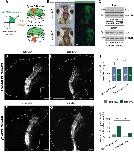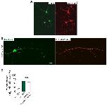 Figure S4. Tctp knockdown compromises axonal mitochondrial function. (A) Stage 32 control and Tctp morphant eye explants were grown in vitro for 24 hours and incubated with MitoTracker to visualize mitochondria. The plot shown here represents the average number of axonal mitochondria found in con-MO- or tctp-MO-positive retinal ganglion cells (boxplot: whiskers cover 5-95 percentile, ‘+’ denotes the mean value; n = no. of axons analysed; *** P < 0.0001, Mann-Whitney test). (B) Plot of axonal mitochondrial length in control and Tctp-depleted retinal ganglion cells (boxplot: whiskers cover 5-95 percentile, ‘+’ denotes the mean value; n = no. of axons analysed; n.s., P = 0.7960, Mann-Whitney test). (C-E) Normal pgc1a expression in HCT116 cells deficient for Tctp. The rational for applying this seemingly indirect approach is not immediate. We knew a priori that basal P53 levels were elevated in tctp+/- mice (Amson et al., 2012) and that the expression of pgc1a was repressed by the activation of P53 in the context of telomere dysfunction (Sahin et al., 2011). Since the mitochondrial traits identified in Tctp morphants were reminiscent of dysfunctional Pgc1α activity (Wareski et al., 2009), we hypothesised that the activation of P53 in Tctp-deficient backgrounds could result in mitochondrial dysfunction due to its repression of pgc1a expression. Hence the strategy used here, for it allowed us to evaluate the expression of pgc1a at the transcriptional level. (C) The promoter region of human pgc1a (2.8 kb) was cloned upstream of the luciferase gene cassette and stably transfected into tctp or control shRNA-infected HCT116 cells. Subsequently, lysates of tctp or control shRNA-infected HCT116 cells were run on a SDS-PAGE gel and Tctp protein expression verified by western blot. Tctp expression knockdown was as high as 85% in these cells (D). We show in (E) a plot of the average relative light units (RLU) measured in cells co-transfected with pgc1a-luc and a control plasmid (mean ± SEM; six biological replicates of tctp-shRNA-infected cells were measured in triplicate in the two independent rounds of experiments conducted; *** P = 0.5544, one-way ANOVA). (F) Quantitative analysis of mitochondrial transport velocities. Population-wide study of mitochondrial velocities (excluding stationary organelles) suggests that no significant differences exist between control and Tctp-depleted axons, in agreement with the dataset shown in Fig. 7I (mean ± s.e.m.; anterograde direction: n.s., P = 0.9941; retrograde direction: n.s., P = 0.9371; statistical analyses used Mann-Whitney test). |