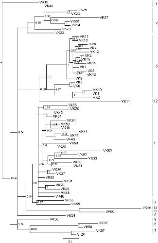 Fig 4. Phylogenetic tree analysis of the 62 Alligator sinensis Vκ genes.A phylogenetic tree of the nucleotides of the Alligator sinensis Vκ segments was constructed. The 12 Vκ gene families are labeled with numbers on the right. Phylogenetic trees were constructed using MrBayes3.1.2 [58] and viewed in TREEVIEW [59].