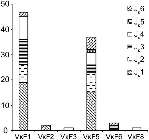 Fig 10. Usage frequency of Vκ and Jκ genes in the Alligator sinensis.The number behind the Vκ indicates the number of families.