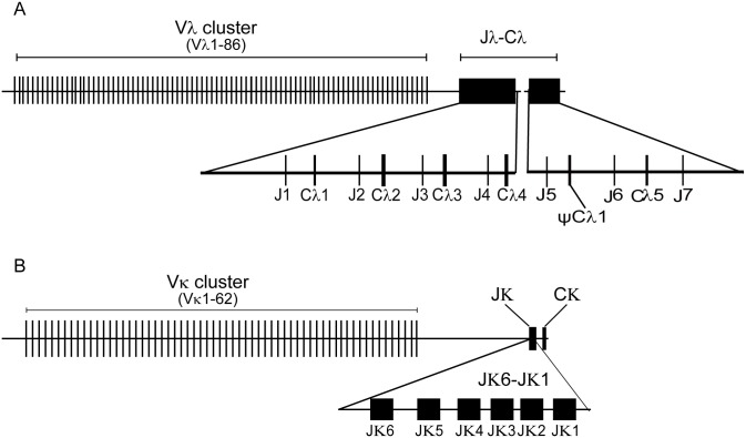 Fig 1. Schematic map of the Alligator sinensis immunoglobulin light chain gene loci.(A) Schematic map of the Alligator sinensis immunoglobulin light chain λ gene loci. (B) Schematic map of the Alligator sinensis immunoglobulin light chain κ gene loci. V: variable gene segments; J: joining gene segments; C: constant region gene; pseudo-variable gene segments were not be shown in the figure.