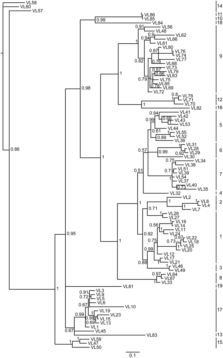 Fig 3. Phylogenetic tree analysis of the 86 Alligator sinensis Vλ genes.A phylogenetic tree of the nucleotides of 86 Alligator sinensis Vλ segments was constructed. The 19 Vλ gene families are labeled with numbers on the right. Phylogenetic trees were constructed using MrBayes3.1.2 [58] and viewed in TREEVIEW [59].