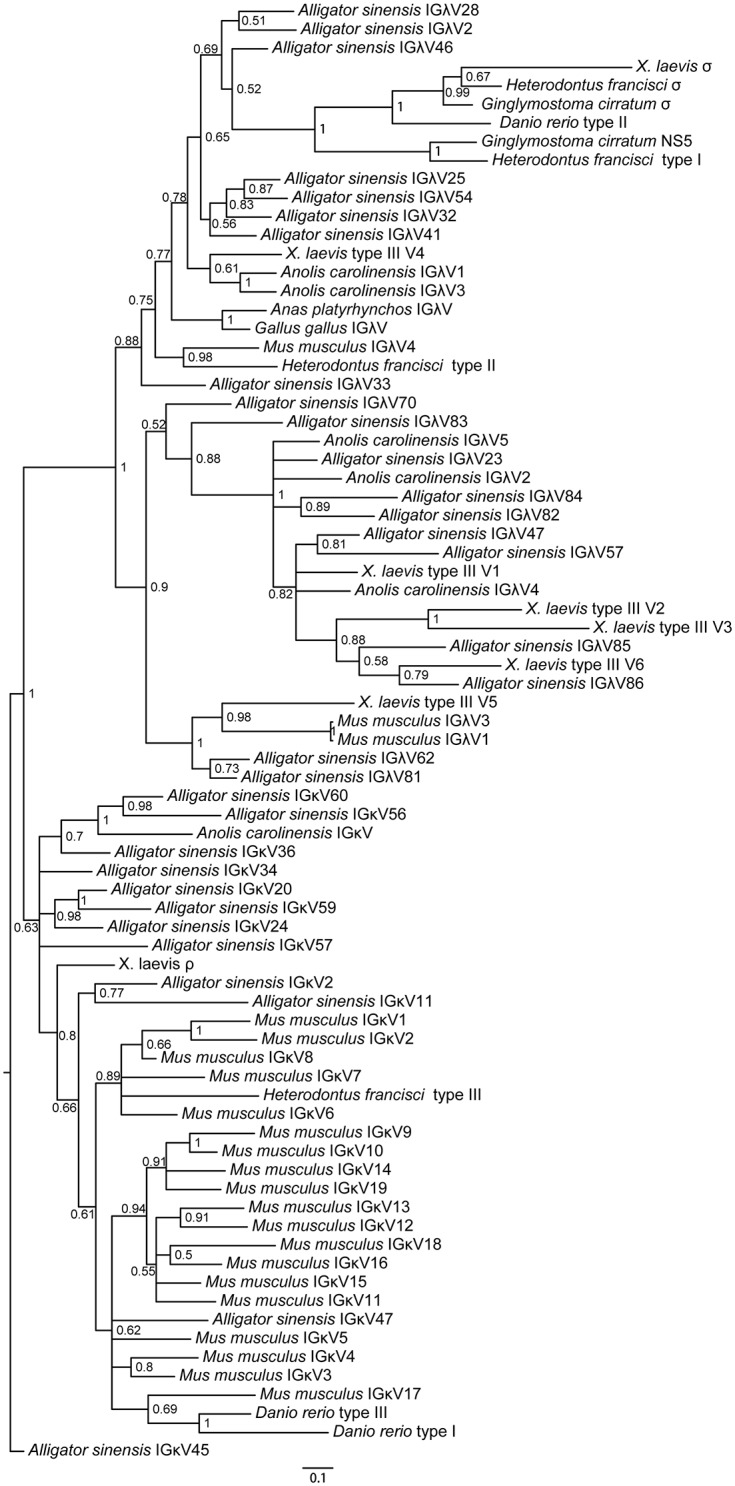 Fig 6. Phylogenetic analysis of the IgL chain V genes in jawed vertebrates.The phylogenetic tree was constructed using V domains. The scale shown as a bar represents the genetic distance (number of nucleotide changes at the given scale). The credibility value for each node is shown. Phylogenetic trees were constructed using MrBayes3.1.2 [58] and viewed in TREEVIEW [59].