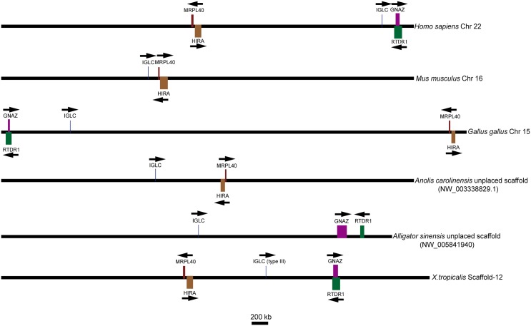 Fig 7. Chromosomal locations of the λ genes in different species and type III genes in X. tropicalis.Arrows indicate the transcriptional orientation of the genes. Chr: chromosome; IGLC: immunoglobulin λ chain constant region gene; GNAZ: guanine nucleotide-binding protein, α z subunit; HIRA: histone cell cycle regulation defective homologue A; MRPL40: mitochondrial ribosomal protein L40; RTDR1: rhabdoid tumor deletion region gene 1. The figure was modified from Ref. [31].