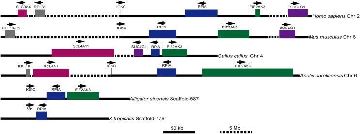 Fig 8. Chromosomal locations of the κ genes in different species and ρ genes in X. tropicalis.Arrows indicate the transcriptional orientation of the genes. Chr: chromosome; IGκC: immunoglobulin κ chain constant region gene; RPIA: ribose-5-phosphate isomerase A; EIF2AK3: eukaryotic translation initiation factor 2-α kinase 3; SUCLG1: succinate-CoA ligase, GDP-forming, α subunit; SLC4A11: solute carrier family 4, sodium borate transporter, member 11; SLC9A4; solute carrier family 9, sodium borate transporter, member 4; RPL31: ribosomal protein L31; RPL19-PS: ribosomal protein L19, pseudogene 8; RPL19: ribosomal protein L19. SLC4A1: solute carrier family 4, sodium borate transporter, member 1. The figure was modified from Ref. [31].