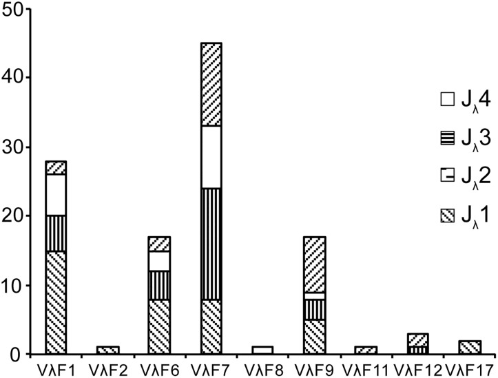 Fig 9. Usage frequency of Vλ and Jλ genes in the Alligator sinensis.The number behind the Vλ indicates the number of the family.